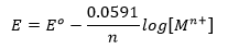 The concentration of solid metal [M] is equal to zero. Therefore, the Nernst equation can be written as