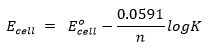 Substituting the values of R,F and T at 25℃, the quantity 2.303 RT/F comes to be 0.0591. Thus the Nernst equation (3) can be written in its simplified form as
